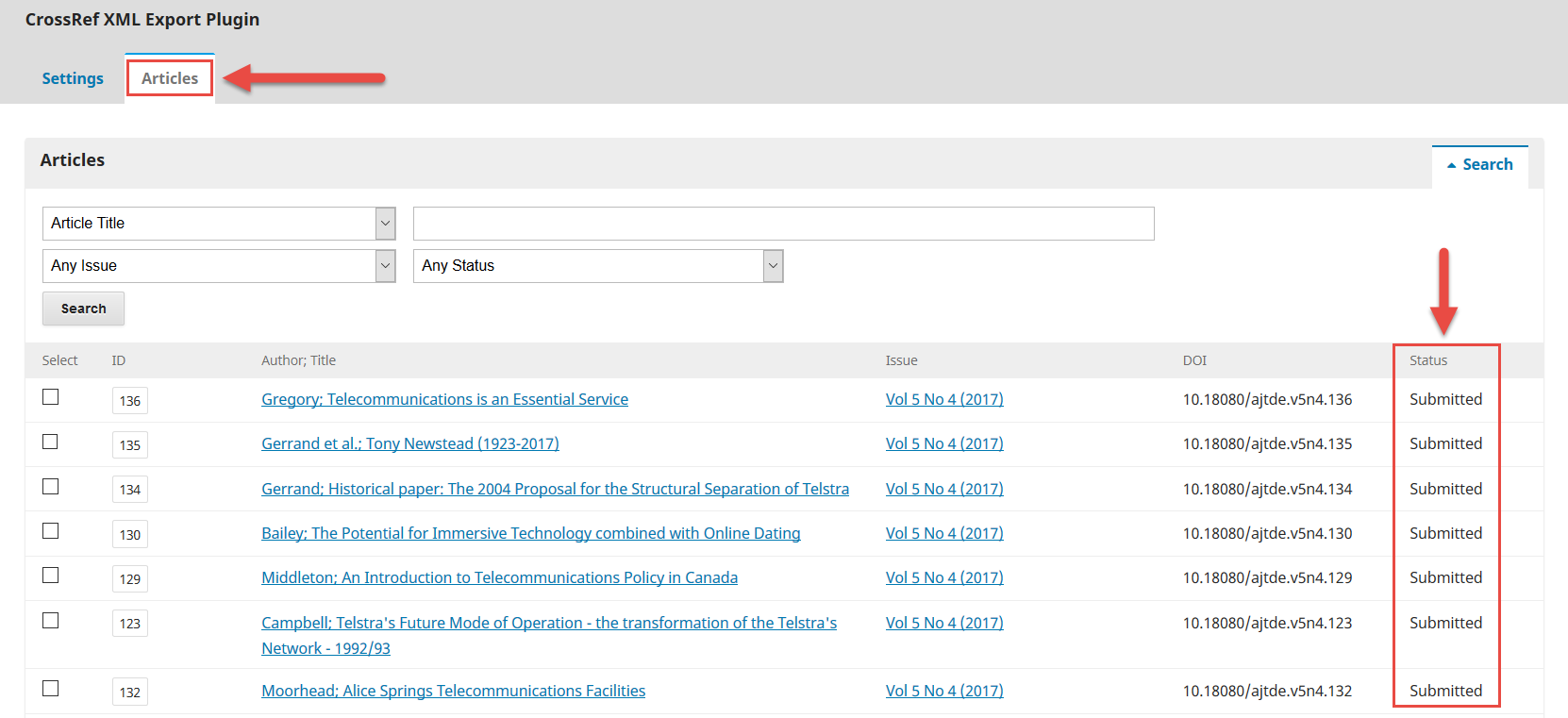 If you have configured the plugin to work automatically, OJS will deposit DOIs as they are created without your intervention. You can check the Articles page to confirm that DOIs have been deposited.
