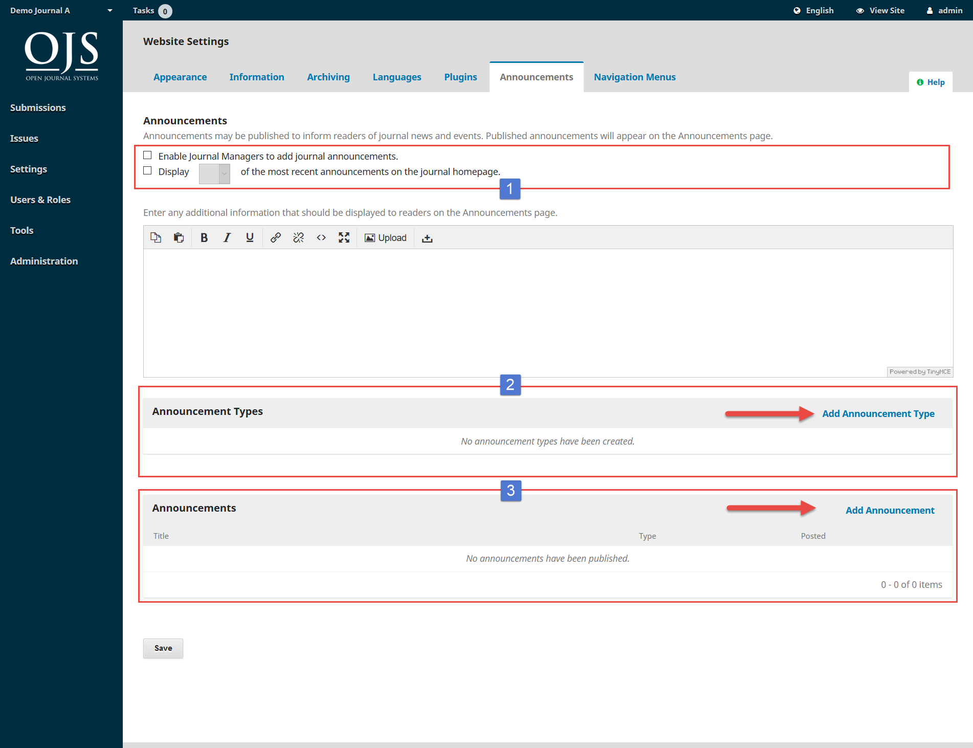 You can configure how announcements will appear on your journal website [1].